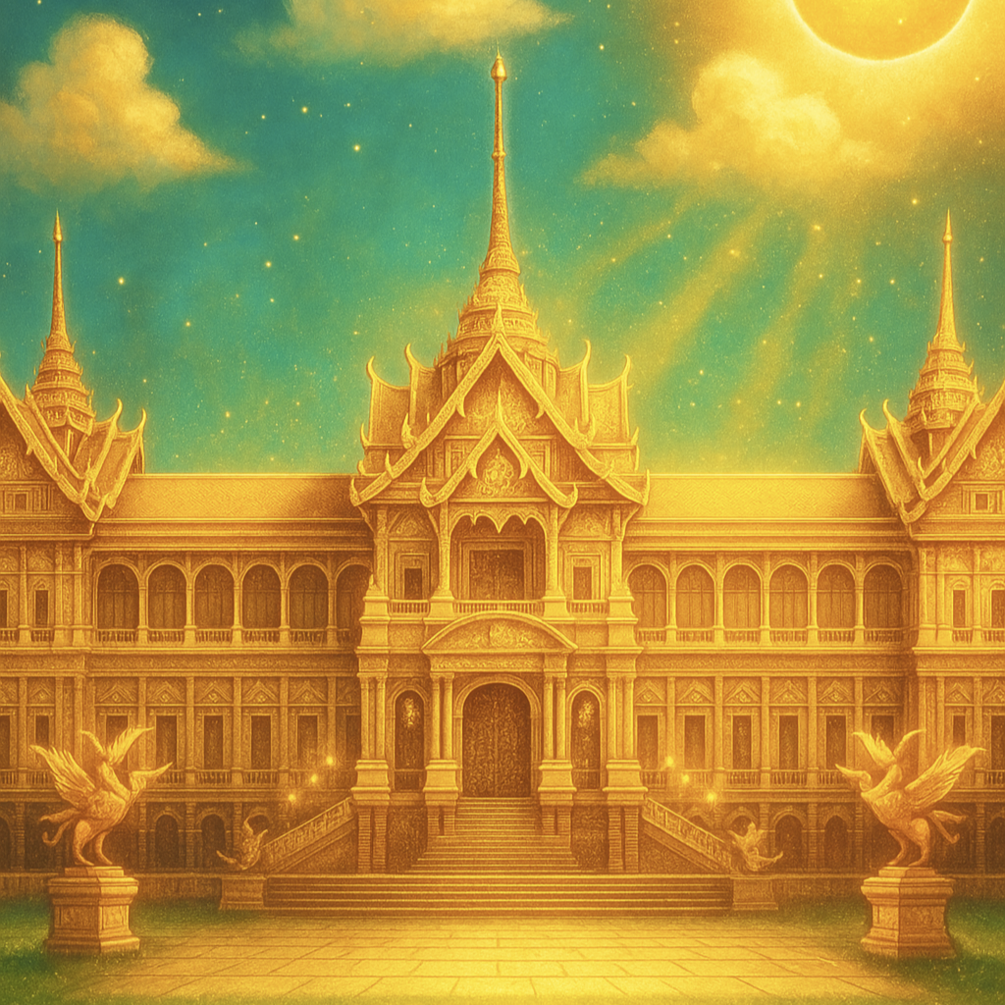 A golden palace shimmers beneath an eclipsed sun, its tiered spires and filigreed roofs rising like folded silk from a sea of light. Ornate stairs and arched galleries lead to a shadowed doorway, inviting entry into a world spun from craft and devotion. Guardian birds flank the steps, poised as sentinels of wonder. The sky glows teal, scattered with stars, drifting clouds, and distant birds that suggest quiet, enchanted motion. Rays spill like woven threads, echoing the legendary tapestry that births realities. The scene feels hushed yet triumphant—a folktale moment when patience and artistry summon an impossible, luminous home.