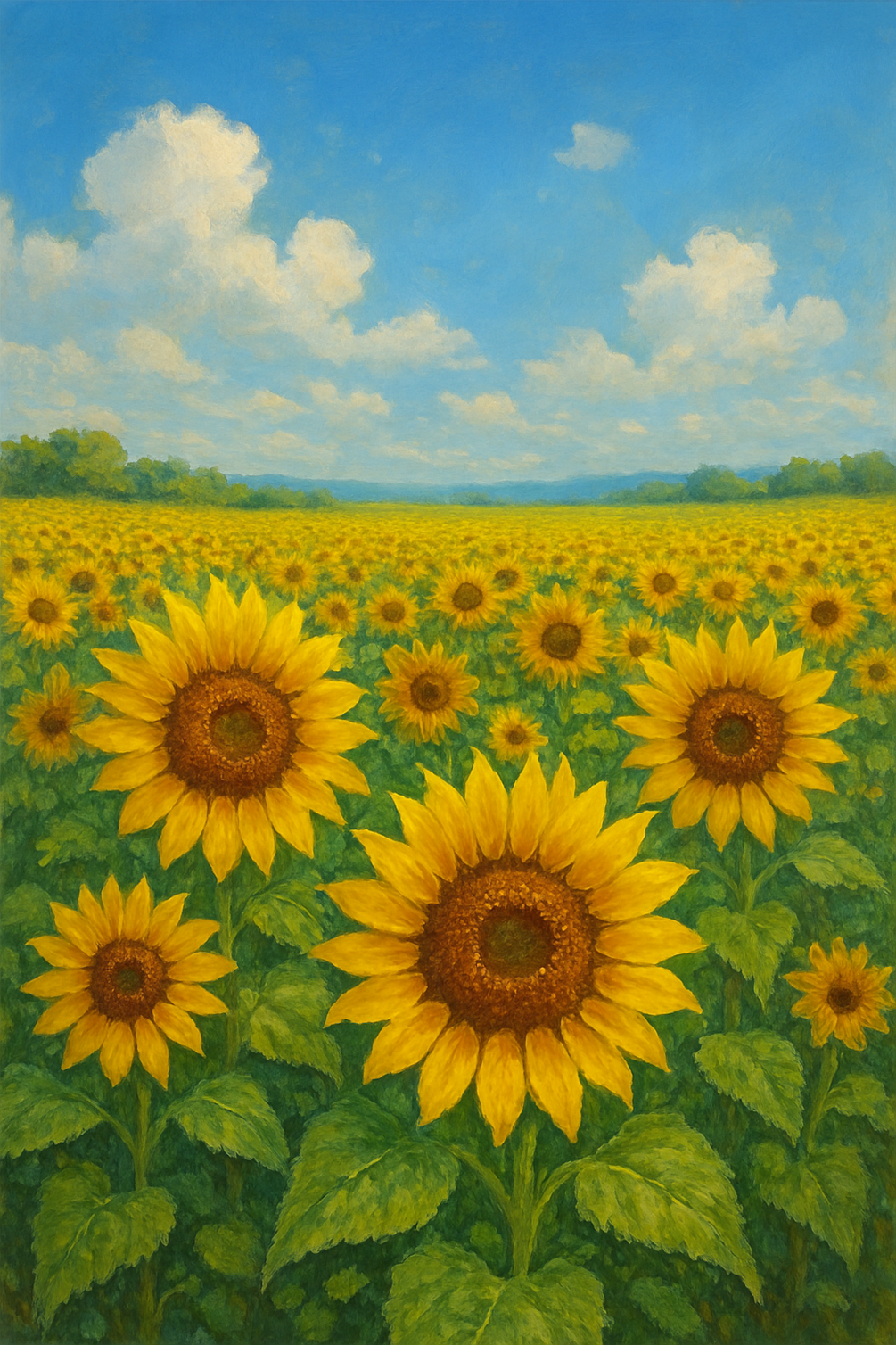 Bring warmth and positivity into your space with this stunning sunflower field wall art. The artwork captures a vibrant field of golden-yellow sunflowers under a clear blue sky, symbolizing joy, energy, and new beginnings. The detailed brush-style textures give it the feel of a hand-painted canvas, making it a timeless piece for any living room, bedroom, or office.